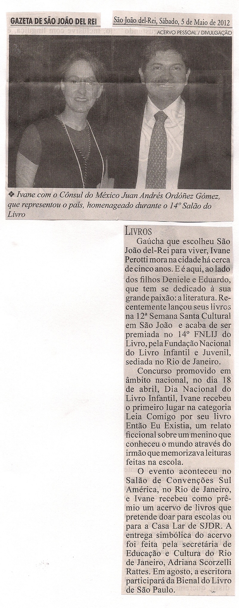 Ivane Perotti, escritora que lançou seus livros recentemente na Semana Santa Cultural de São João del-Rei, foi premiada na 14º FNLIJ do Livro, pela Fundação Nacional do Livro Infantil e Juvenil.