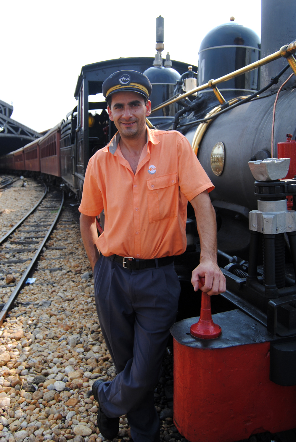 O maquinista Alexandre Augusto Goddi Campos tem orgulho em atender os turistas